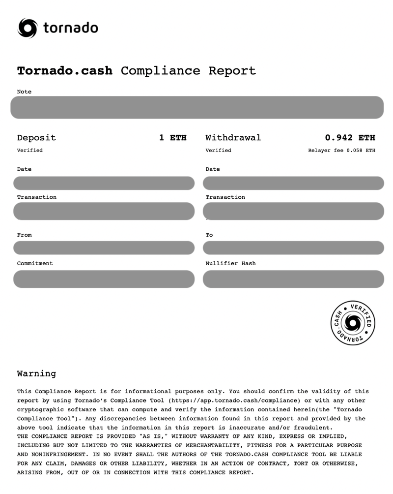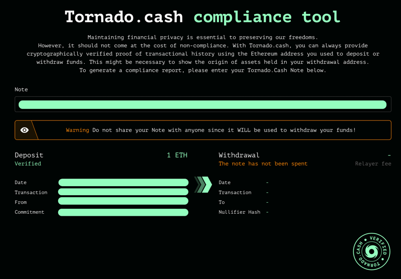 因此，如果您需要证明从 Tornado.Cash 池中提取的资产的来源，我们邀请您使用以下[合规工具](https://tornadoeth.cash/compliance)👍