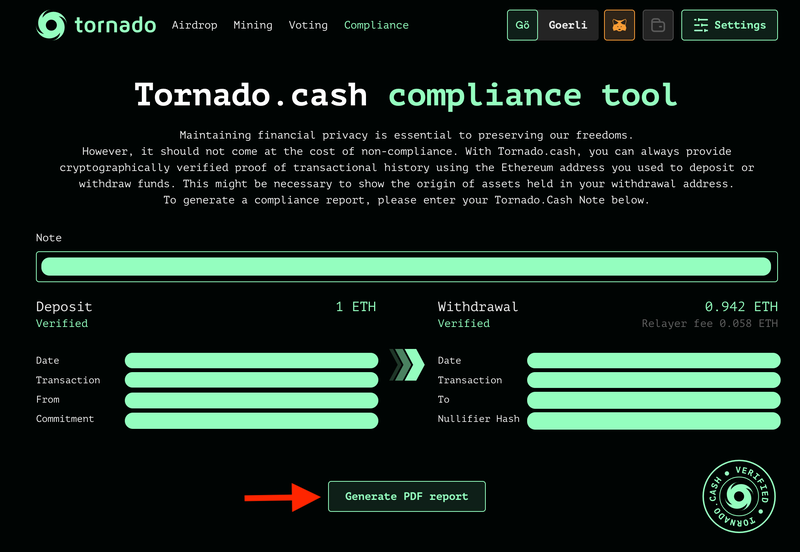 在此范围内，**Tornado.Cash 合规工具使用户能够证明其资金来源。**&#x501F;助每次存款后生成的注释，此工具将使用用于存入和提取资产的以太坊地址**发出经过加密验证的交易历史证明。**